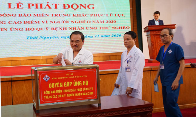 Chiều 13-11, Bệnh viện Trung ương Thái Nguyên tổ chức Lễ phát động ủng hộ đồng bào miền Trung bị thiên tai, hưởng ứng Tháng cao điểm “Vì người nghèo” năm 2020 và ủng hộ Quỹ bệnh nhân ung thư nghèo (ảnh).