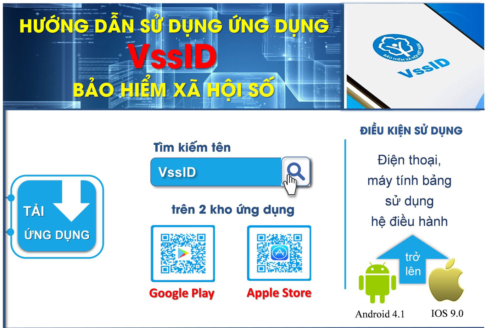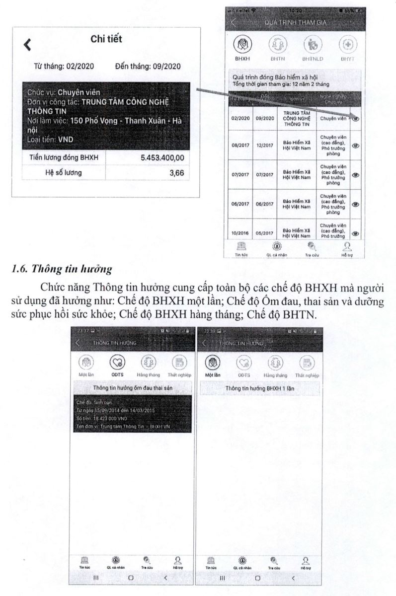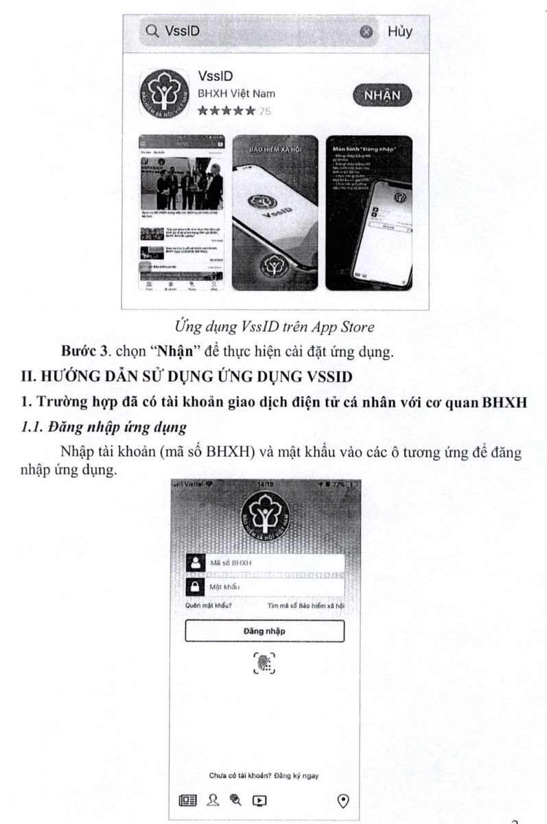 Người tham, gia BHXH, BHYT vào kho ứng dụng AppStore hoặc CH - Play trên thiết bị di động, gõ vào ô tìm kiếm từ khóa “VsslD” thực hiện cài đặt ứng dụng, đăng nhập số sổ BHXH, mật khẩu (tin nhắn của BHXH Việt Nam gửi đến số điện thoại đã đăng ký). Sử dụng App VssID để theo dõi và tra cứu quá trình tham gia BHXH, BHYT, BHTN, thẻ BHYT, thông tin hường các chế độ BHXH...