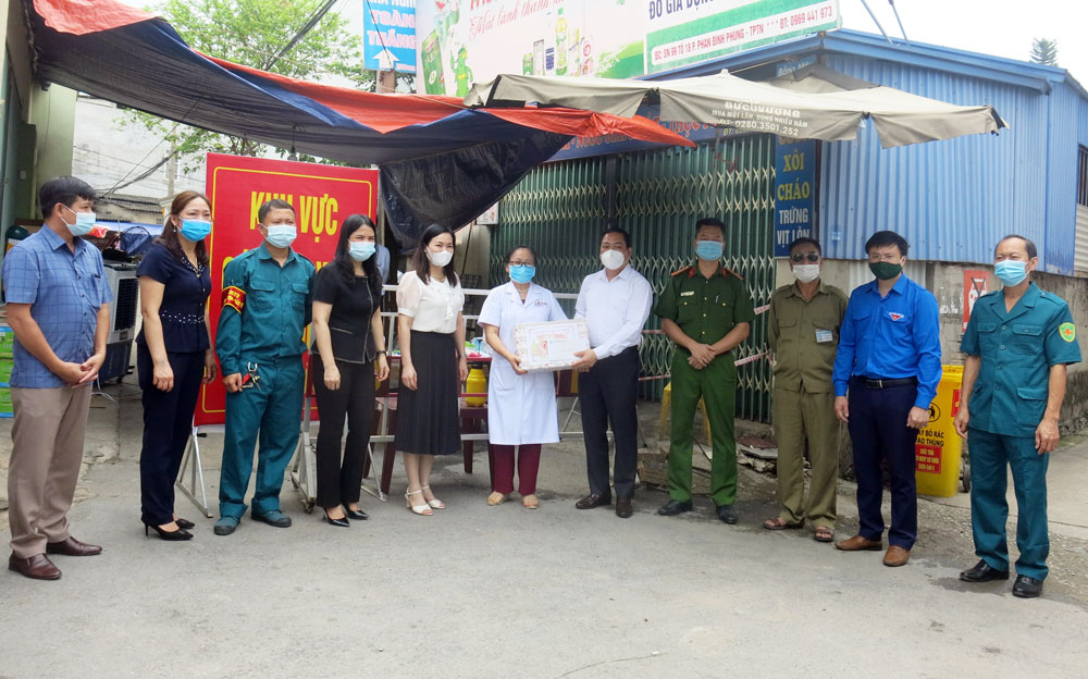 Tại đây, đoàn đã trao tặng 10 triệu đồng; cá nhân đồng chí Nguyễn Hoàng Mác, Phó Bí thư Thường trực Thành ủy tặng 3 triệu đồng cho lực lượng tham gia nhiệm vụ tại 3 chốt phong tỏa. Các đồng chí trong đoàn công tác đã thăm hỏi, động viên, chia sẻ với lực lượng tham gia trực ở 3 chốt, mong muốn các đồng chí khắc phục khó khăn, tiếp tục nỗ lực thực hiện tốt nhiệm vụ được giao.
