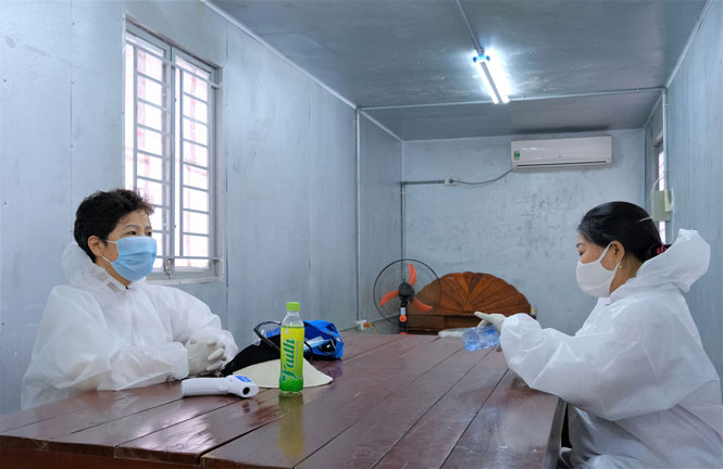 “Khi chốt được lắp đặt thùng container và máy lạnh chúng tôi luân phiên làm việc 40 phút rồi lại tranh thủ vào nghỉ ngơi hồi sức, ai cũng phấn khởi vì được sự quan tâm của cấp trên và các nhà hảo tâm”, chị Trần Thị Huệ, Cán bộ y tế Chốt kiểm soát liên ngành phòng dịch COVID-19 nút giao Thịnh Đán (T.P Thái Nguyên). Trong ảnh: Chị Trần Thị Huệ cùng đồng nghiệp nghỉ dưỡng sức tại nhà container.