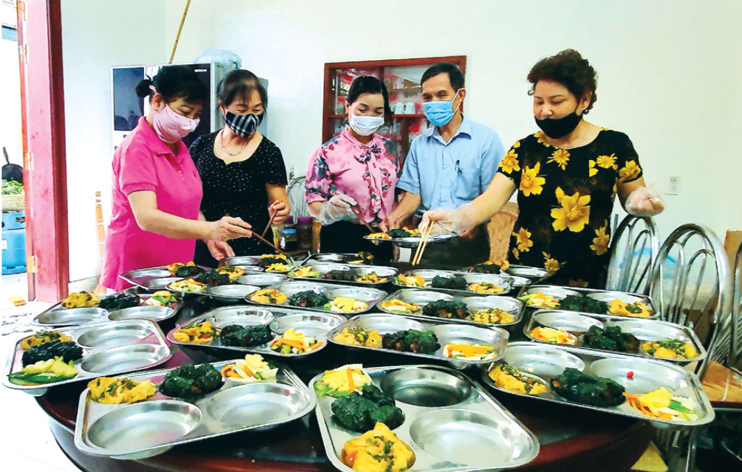 Còn bà Nguyễn Thị Hồi, thành viên cao tuổi nhất của nhóm (năm nay 68 tuổi) thì phụ trách chung. Bà đặc biệt quan tâm đến vệ sinh an toàn thực phẩm. Bà nói, các thành viên trước khi vào bếp phải rửa tay, đeo găng, khi nấu phải giữ khoảng cách. Sau gần hai tiếng đồng hồ, món ăn được nấu chín, các thành viên lại sắp vào đĩa, bọc màng thực phẩm và chuyển đến chốt kiểm dịch. Chị Nguyễn Thị Huệ, nhân viên y tế phường Quang Vinh thường xuyên trực tại chốt vào buổi trưa chia sẻ: “Tôi thường xuyên ăn trưa tại chốt. Trước đây, tôi phải mua cơm hộp. Từ khi được nhận được sự giúp đỡ của CLB, tôi không phải mua cơm nữa và cảm thấy yên tâm về an toàn thực phẩm, bảo đảm sức khỏe để thực thi nhiệm vụ”.
