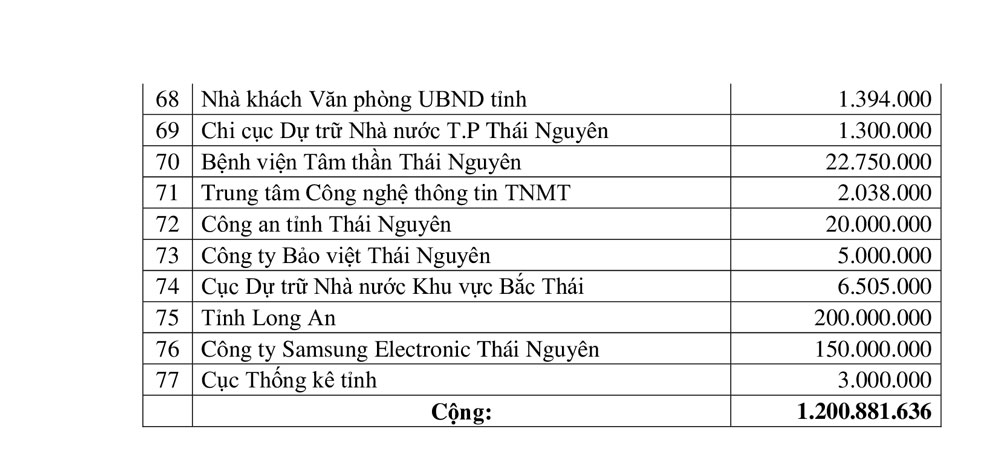Ban Thường trực Uỷ ban MTTQ tỉnh, Ban Vận động Quỹ "Vì người nghèo” tỉnh Thái Nguyên trân trọng cám ơn sự ủng hộ kịp thời của các cơ quan, tổ chức, đơn vị, các nhà hảo tâm.