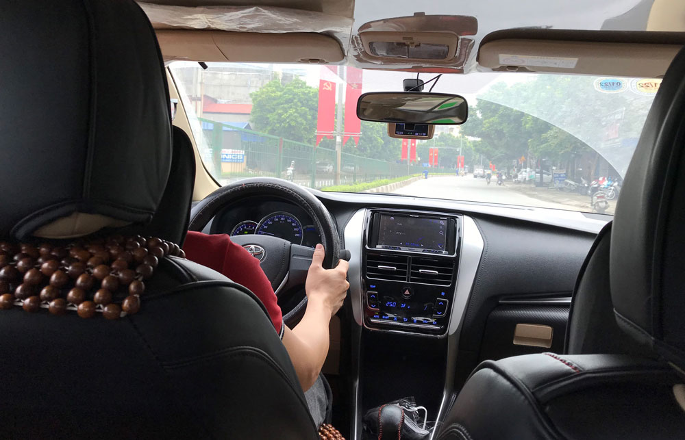 Chưa đầy 15 phút sau, một chiếc xe 4 chỗ đã đến đón chúng tôi đúng vị trí. Lên xe, tài xế tự xưng tên C. rất niềm nở hỏi địa điểm chúng tôi muốn đến tại Hà Nội, nhưng không hề nhắc tới việc lấy thông tin khách hàng hay khai báo y tế. Đi xe được 10 phút, tôi lựa lời hỏi: