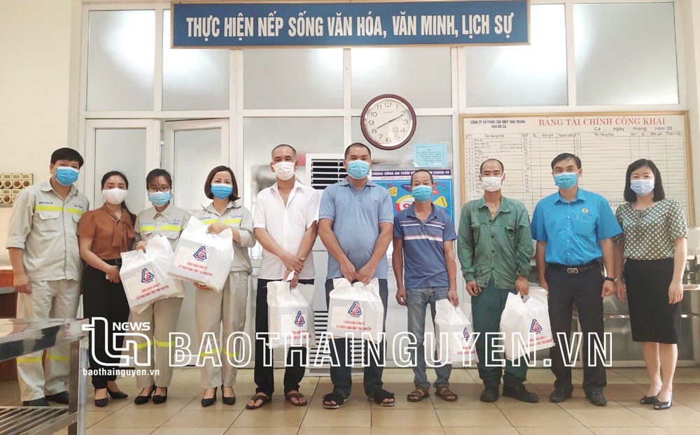 Đại diện Ban Thường vụ Công đoàn Công ty trao quà cho CNVCLĐ có hoàn cảnh khó khăn tại Công ty CP Cán thép Thái Trung.