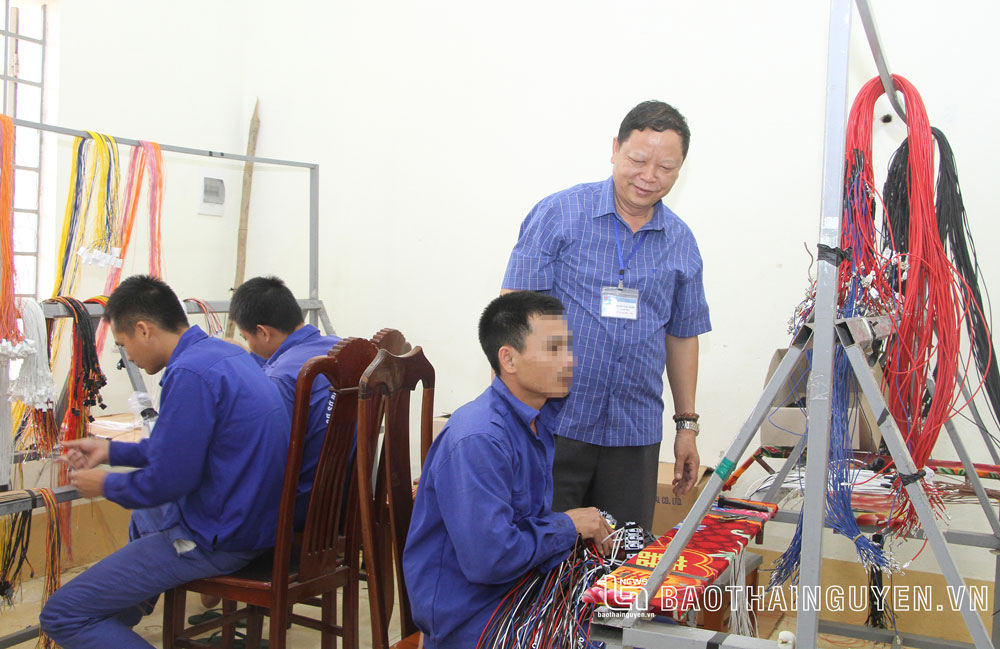 Nơi tập trung đông học viên hơn cả là khu quấn dây điện, mọi người vừa làm việc vừa trò chuyện rất rôm rả. Trong số 20 học viên đang làm tại đây thì người vui nhất là anh Lê Văn T., ở xã Tân Thái (Đại Từ), bởi chỉ còn 2 tháng nữa khi hết thời gian điều trị, anh sẽ sang Hàn Quốc lao động.