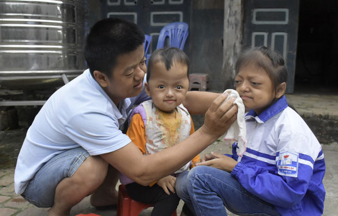 Còn bé Ly năm nay 3 tuổi, đầu to, trán gồ lên cao và mắt luôn nhìn lệch xuống. Chị Hà cho biết: “Cháu mới đi viện về, không chịu ăn uống, cố cho ăn là nôn ra, hay quấy khóc, thỉnh thoảng bị co giật, động kinh. Lần lượt hết bố lại đến con thay nhau nằm viện, có những tháng ở viện nhiều hơn ở nhà”.