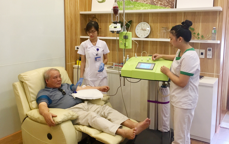 Thạc sĩ, bác sĩ Phan Thanh Nhung, Phó Trưởng Khoa Khám bệnh theo yêu cầu cho biết: Đây là một liệu pháp máu tự thân lớn (điều trị máu ngoại bào và truyền lại vào cơ thể ngay lập tức) để hồi sinh, phục hồi rối loạn tuần hoàn và kháng các bệnh do vi rút, hoặc để kích hoạt chung hệ thống miễn dịch. Với phương pháp này, từ 50 đến 100ml máu của chính bệnh nhân được lấy ra bằng vật liệu, dụng cụ vô trùng dùng một lần, pha trộn với một lượng Ozone y tế được xác định và đo chính xác. Trong đó, 100% phản ứng đặc biệt với các tế bào màu đỏ và màu trắng để kích hoạt quá trình trao đổi chất của chúng. Ozone được tiêu thụ hoàn toàn cho quá trình kích hoạt khi oxy đi qua máu trong quá trình truyền. Máu được kích hoạt ngay lập tức được tái sử dụng dưới dạng truyền nhỏ giọt bình thường…