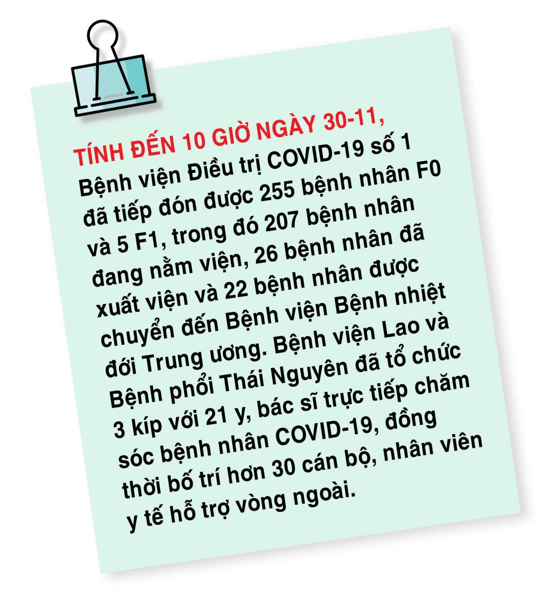 Với biết bao nỗ lực, các “chiến sĩ áo trắng” của Bệnh viện Điều trị COVID-19 số 1 đã không chỉ ngăn F0 trở nặng, mà còn giúp F0 thành “0 F”, âm tính với vi rút SARS-CoV-2. Ngày 20-11, 7 bệnh nhân đầu tiên của Bệnh viện được xuất viện, đến 10h ngày 30-11 có tổng số 26 bệnh nhân được xuất viện. Đây đều là những bệnh nhân không triệu chứng hoặc triệu chứng nhẹ, đã qua 9 ngày theo dõi, điều trị, nhận kết quả âm tính bằng phương pháp PCR. Chị Nguyễn Vân Anh, điều dưỡng tại Bệnh viện bảo: Khó tả hết niềm vui của bệnh nhân ngày xuất viện. Ai nằm viện cũng mong ngày về với gia đình và chắc chắn niềm mong mỏi ấy rất lớn ở tất cả bệnh nhân và chúng tôi.