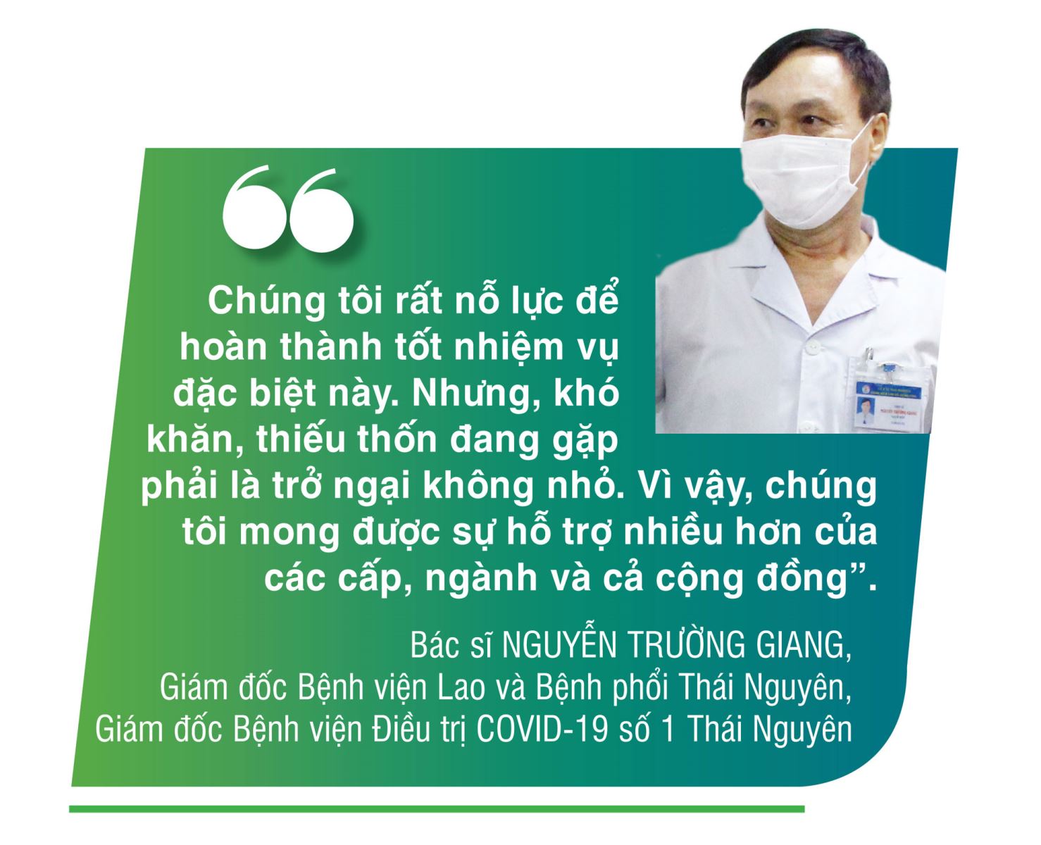 Trước đây, khi tỉnh xuất hiện các ca nhiễm SARS-CoV-2 đầu tiên, cả cộng đồng đã chung tay ủng hộ các địa phương, nhất là huyện Phú Bình, T.X Phổ Yên chống dịch. Thời điểm này, với những yêu cầu bức thiết đòi hỏi, chắc chắn Bệnh viện Điều trị COVID-19 số 1 và các cơ sở y tế điều trị bệnh nhân COVID-19 khác sẽ rất cần sự quan tâm của cả cộng đồng.