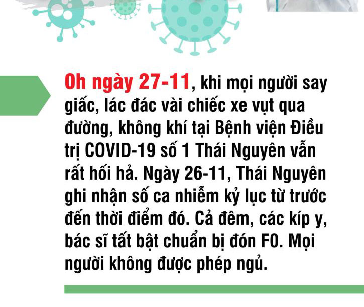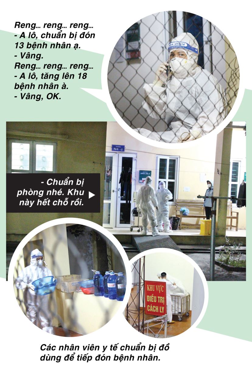 Sau cuộc điện thoại, các chuyến xe cứu thương liên tục đưa bệnh nhân đến. 21h30: 1 bệnh nhân; 22h50: 5 bệnh nhân; 23h03: 6 bệnh nhân; 00h44 27-11: 6 bệnh nhân. Những ngày sau, bệnh nhân liên tiếp được chuyển đến. Các y, bác sĩ Bệnh viện Điều trị COVID-19 nhiều đêm thức trắng tiếp đón người bệnh.