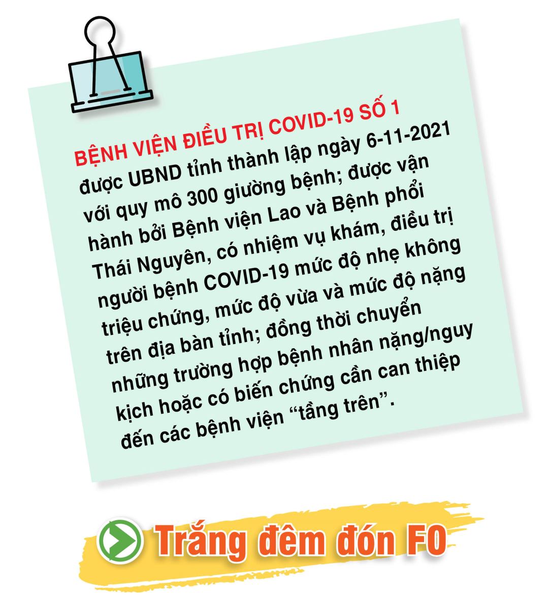 Trời tối, dưới ánh đèn cao áp, dù ở khoảng cách khá xa nhưng chúng tôi vẫn thấy nụ cười của các bệnh nhân đang được điều trị tại đây, trong đó có chị Đ.T.Q. Chị Q. công tác tại Trạm Y tế xã Thuận Thành (T.X Phổ Yên), từng chống dịch tại nhiều điểm nóng tại địa phương. Trong một lần trực trạm, chị bị lây bệnh. Chị Q. bảo: Tôi thấu hiểu nỗi vất vả và cảm phục tinh thần, sự lạc quan của các y, bác sĩ trong Bệnh viện. Nhiều khi gặp các anh, các chị là mình thấy vui, thấy khỏe rồi.