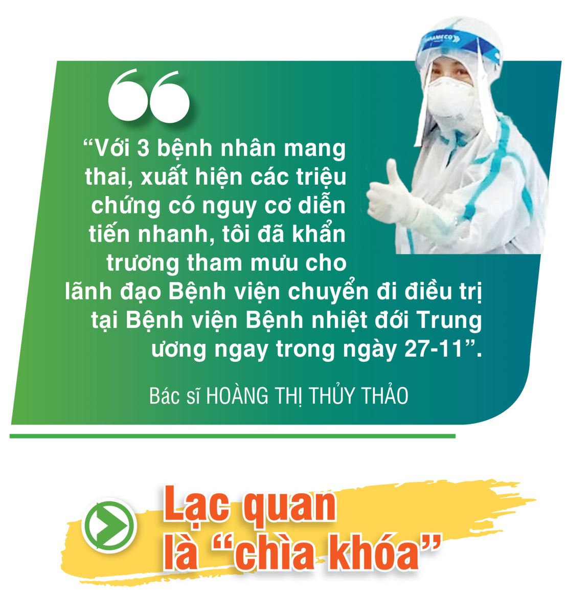 Nơi tuyến đầu chống dịch, các y, bác sĩ Bệnh viện Điều trị COVID-19 số 1 đã nhiều đêm không ngủ, nhiều tuần chưa được về nhà, chưa được trực tiếp gặp gỡ những người thân yêu nhất, nhưng những “chiến sĩ áo trắng” ấy lúc nào cũng lạc quan, kiên cường. Những khó khăn, vất vả, áp lực không làm họ sờn lòng. Các anh, các chị đang là những “người hùng” tạo nên một phòng tuyến vững chắc, giúp cộng đồng vững tin hơn để cùng đẩy lùi đại dịch.