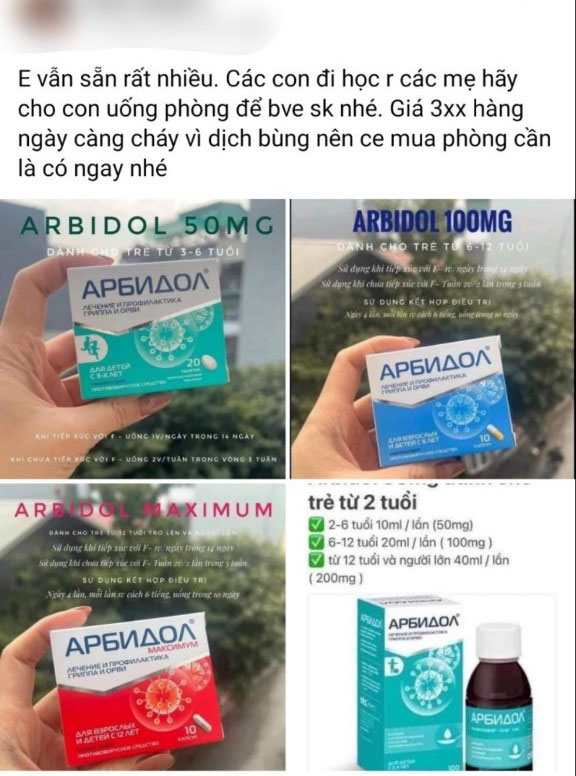 Liên hệ với chủ tài khoản Facebook “Anla Duyen”, chúng tôi được giới thiệu: “Em đang bán 2 loại thuốc điều trị COVID-19 là Liên Hoa Thanh Ôn của Trung Quốc với giá 250 nghìn đồng/hộp 36 viên và thuốc Arbidol của Nga với giá 550 nghìn đồng/hộp 10 viên. Hiện, thuốc Arbidol của Nga đang “cháy hàng”, anh muốn mua thì phải đặt trước...
