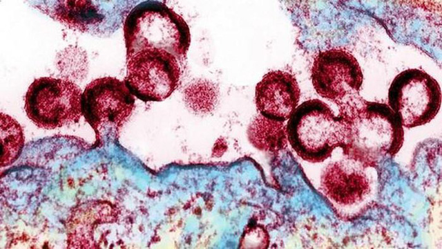 Khi một tế bào miễn dịch đang nghỉ ngơi bị nhiễm HIV tiềm ẩn được kích hoạt trở lại, tế bào bắt đầu tạo ra các virion HIV (màu đỏ) nảy chồi và giải phóng ra khỏi tế bào (màu xanh lam) - Nguồn: statnews.com